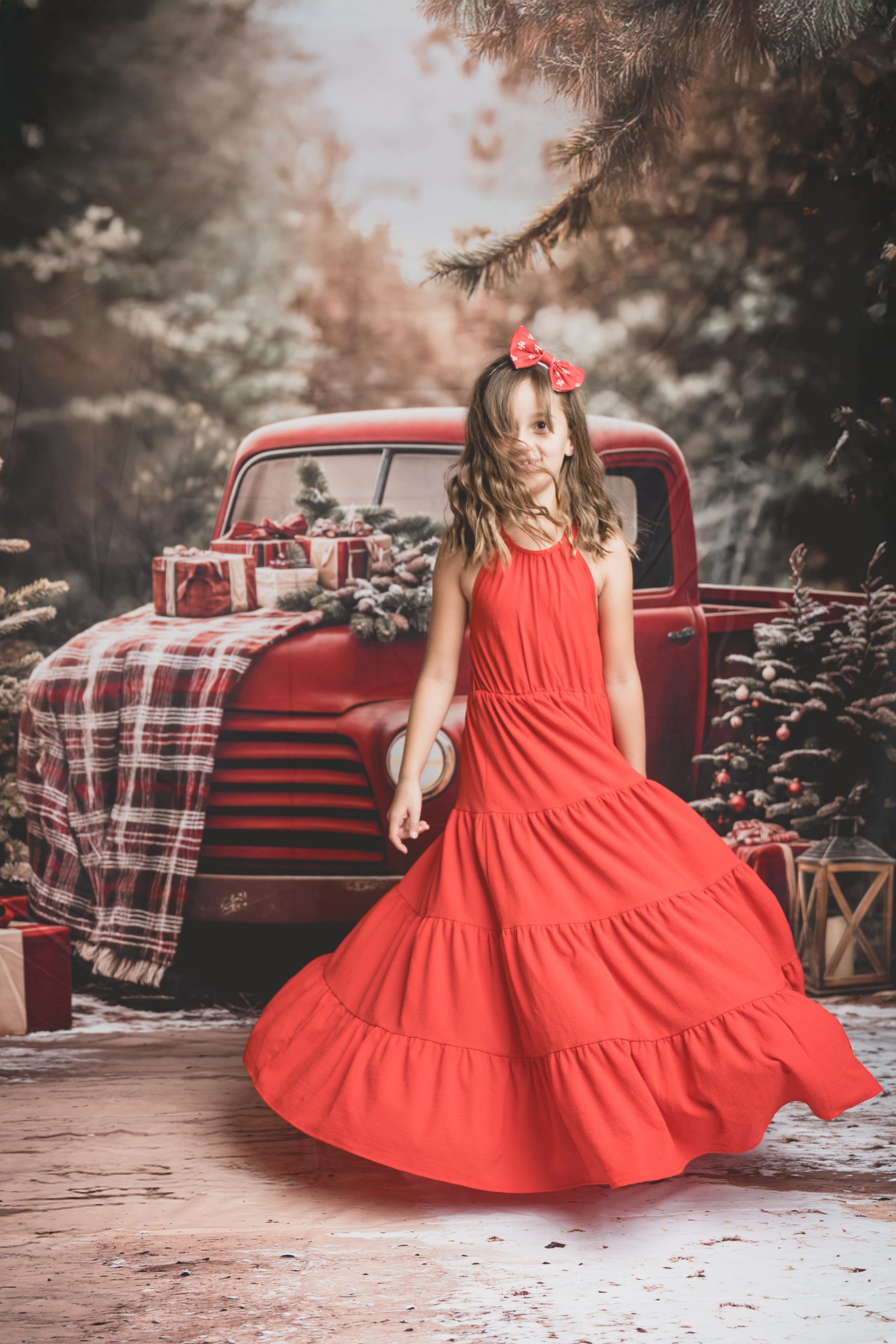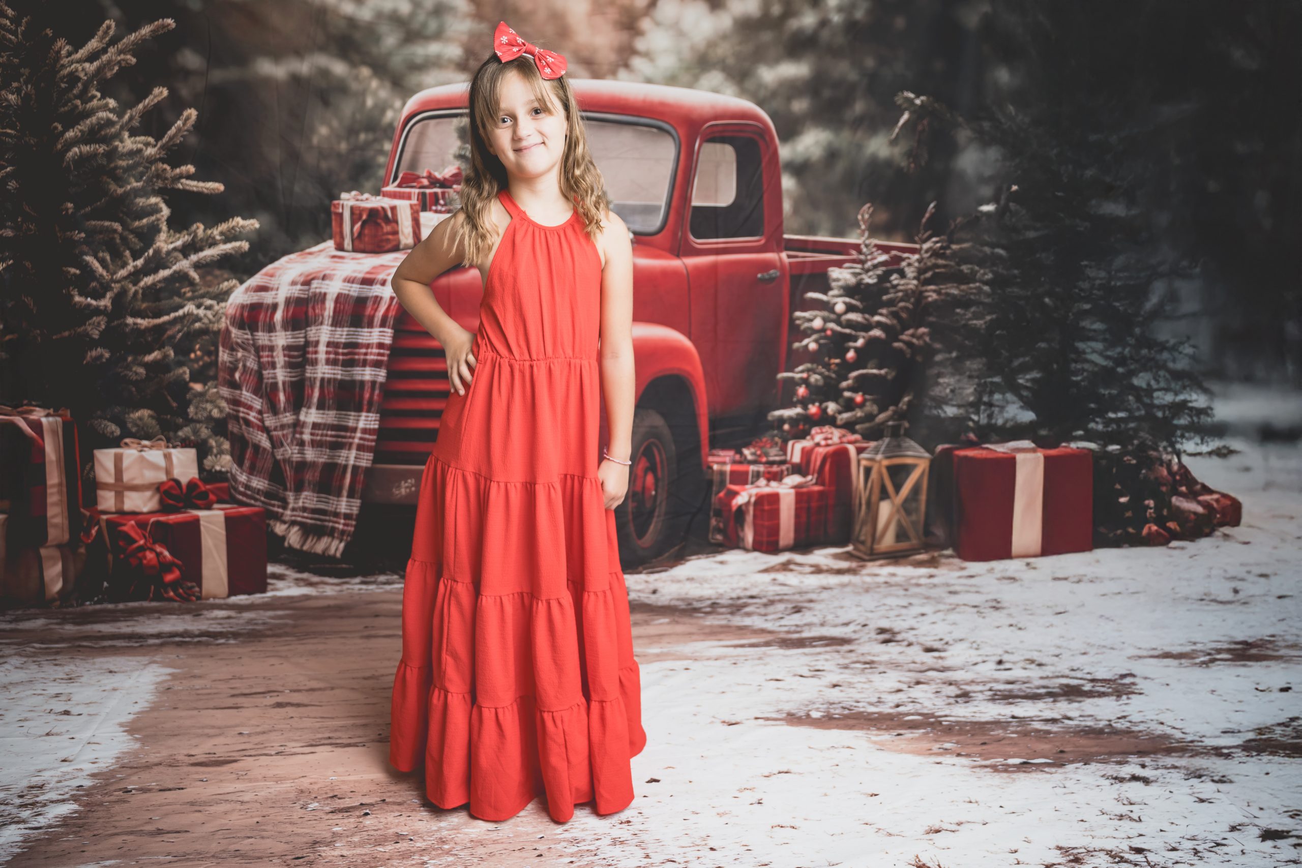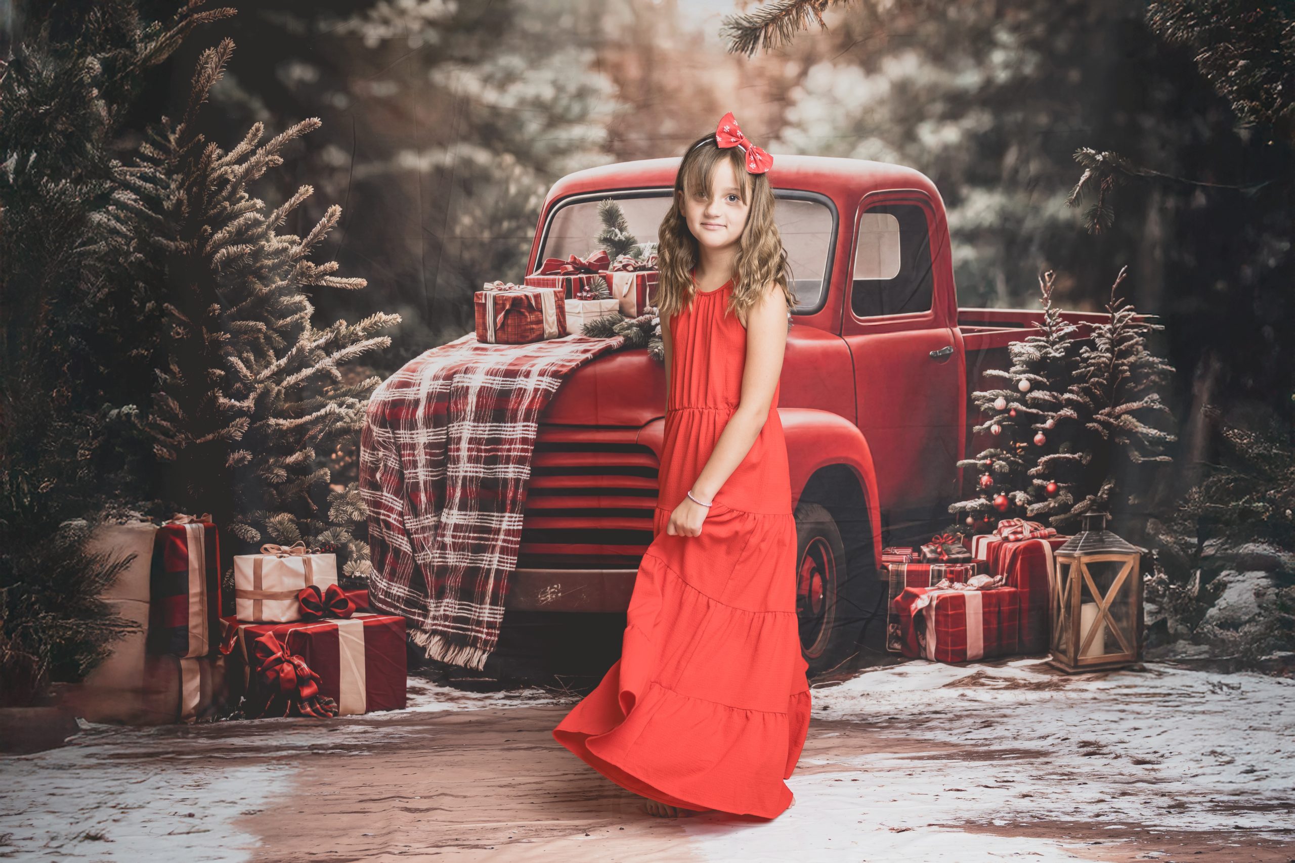 Un décor chaleureux et festif, avec son vieux camion rouge chargé de cadeaux, au cœur d’une forêt enneigée. Idéal pour des portraits de famille pleins de complicité et de douceur.