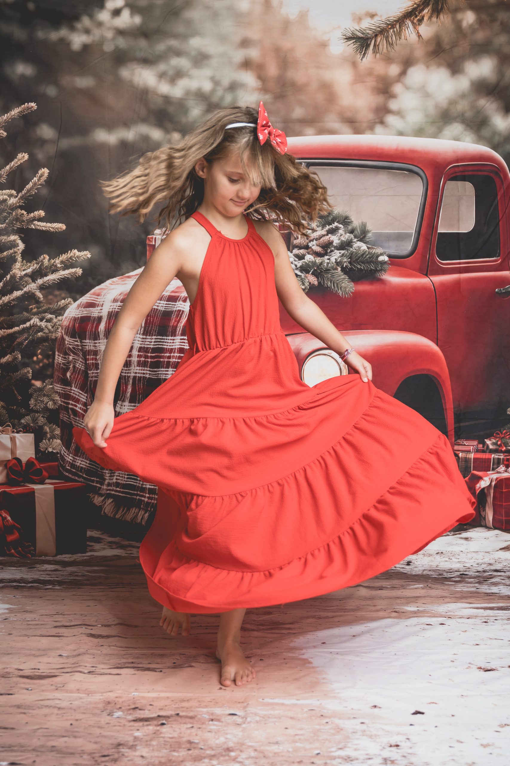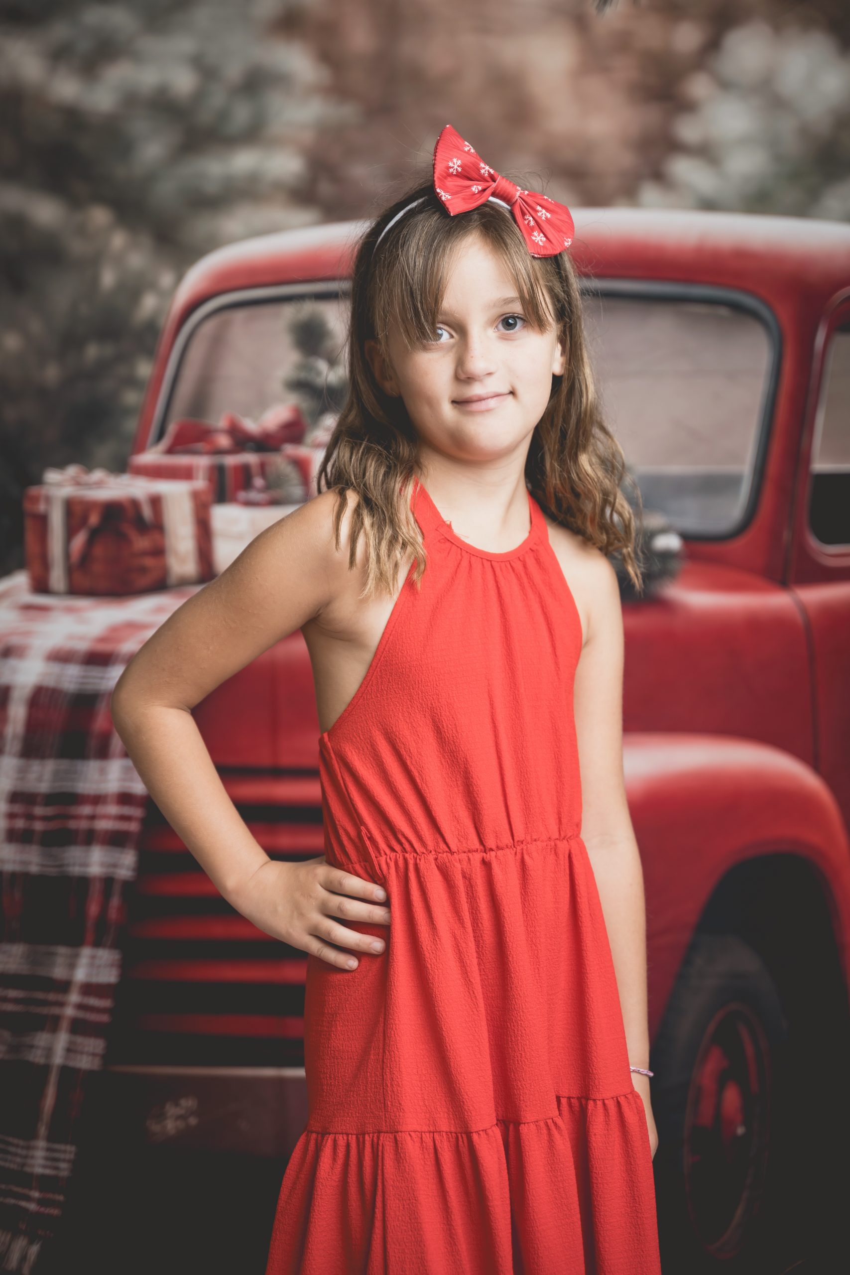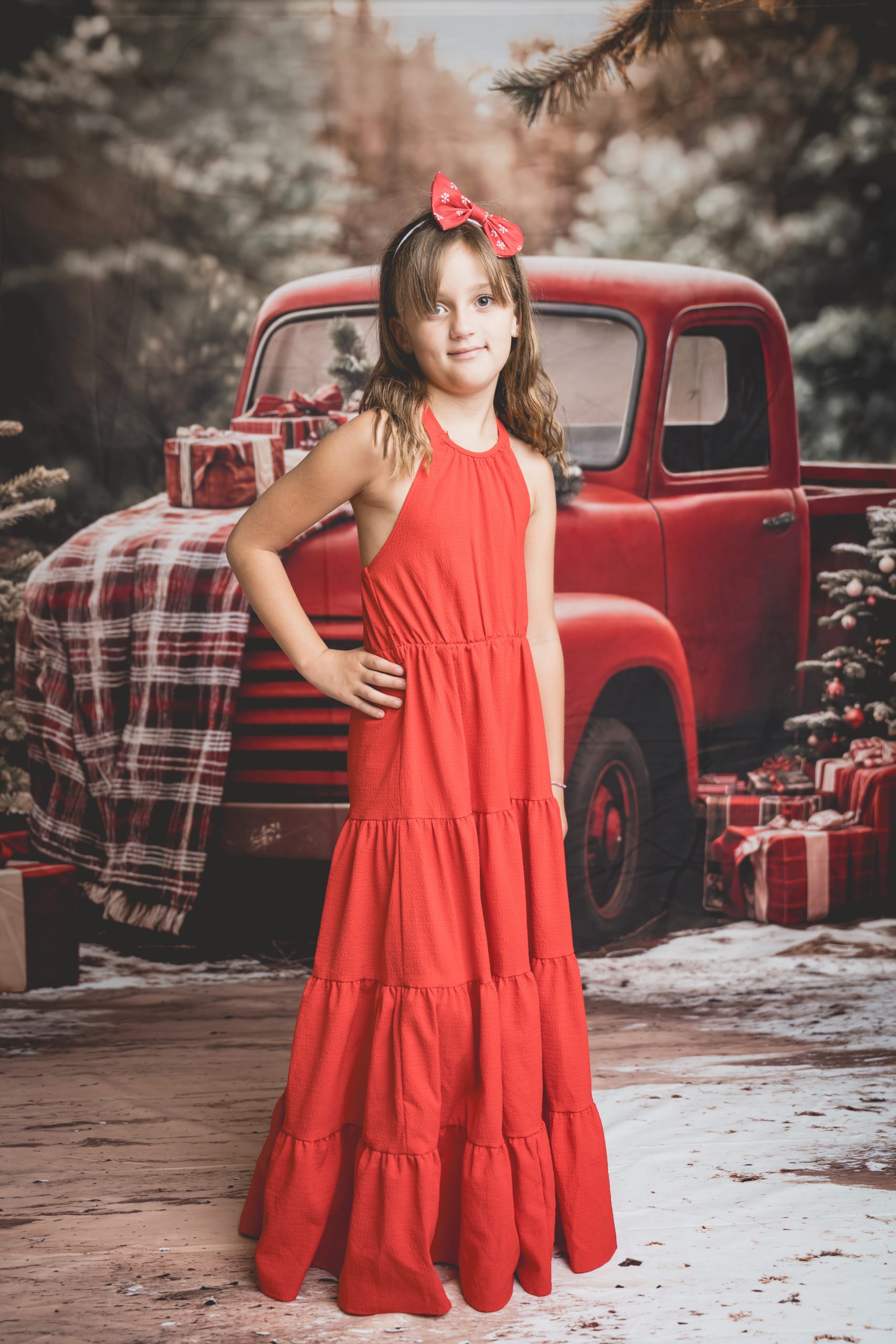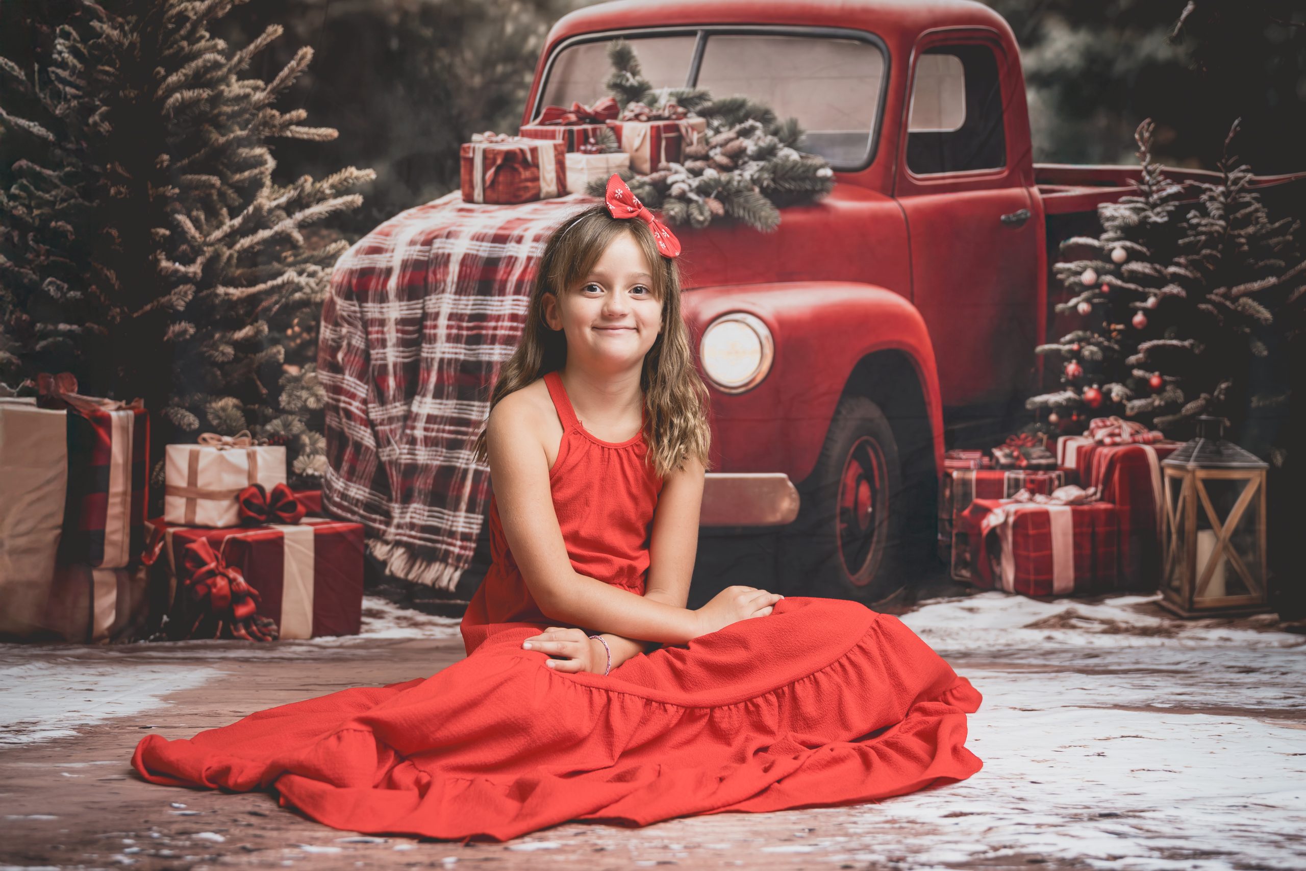 Un décor chaleureux et festif, avec son vieux camion rouge chargé de cadeaux, au cœur d’une forêt enneigée. Idéal pour des portraits de famille pleins de complicité et de douceur.
